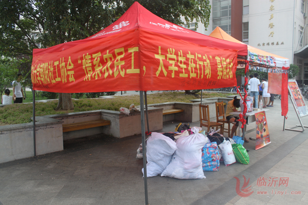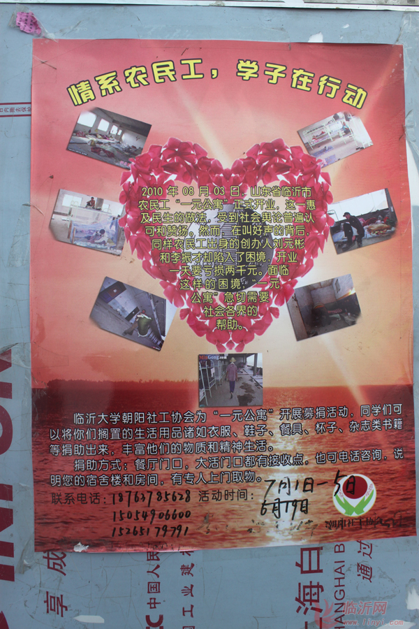 由临沂大学朝阳社工协会组织的“ 情系农民工,大学生在行动”为临沂“一元公寓”募捐活动在临沂大学小广场举行,活动时间为7月1日到5日。目前,朝阳社工协会组织已经收到大学生捐赠的很多的衣物、生活用品、被褥等。
