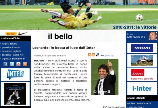 新浪体育讯 北京时间7月1日,国米官方宣布正式与莱昂纳多解约,新帅加斯佩里尼将在下周二正式入主梅阿查。 国米主席莫拉蒂称:“感谢莱昂纳多带队六个月并且取得了不错的成绩,我们拿下了意大利杯冠军,莱帅是值得尊重的人,并祝愿他在今后的执教生涯取得更加辉煌的成就。” 2010年12月24日,莱昂纳多在质疑声中接替了贝尼特斯成为国米主帅,与蓝黑军团签订了18个月的合同。巴西少帅的开局非常理想,12轮联赛狂揽30分,不过,米兰德比0比3惨败以及欧冠1/4决赛被沙尔克淘汰,让国米早早结束了联赛及欧冠卫冕的梦想。但莱昂纳多依然率队锁定联赛第二的位置,并率队拿到意大利杯冠军。按照《队报》的说法,在同国际米兰解约后,莱昂纳多将会前往法国巴黎圣日尔曼就任技术总监。 对于新帅加斯佩里尼,莫拉蒂称加帅与国米的两年合同已经提交给了联盟,加斯佩里尼将在下周二正式入主梅阿查出任国米主帅。 加帅则表示已经等不及了,很荣幸即将成为国米主帅,这将是职业生涯光辉的一刻,当前最主要的事是和俱乐部合作搞好季前训练工作。