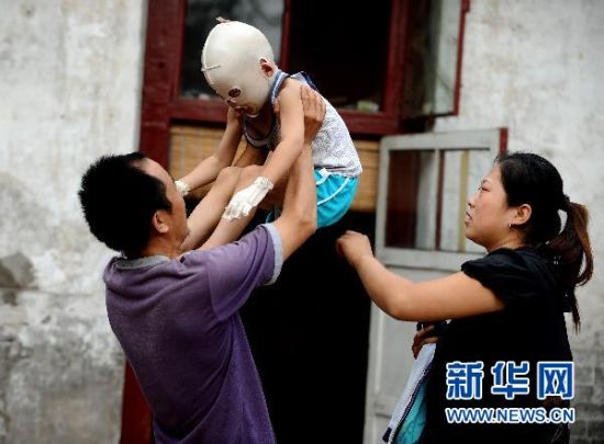 童年本该是快乐的、晴朗的。然而对于山西汾阳的娃娃湘湘来说,童年却是痛苦的、灰色的——由于意外被烧伤,6岁的湘湘不得不每日戴着“面具”生活。近日,湘湘的不幸遭遇成为网络关注的焦点,数百万网友发起“总动员”,拯救“面具娃娃”!新华社记者 燕雁 摄