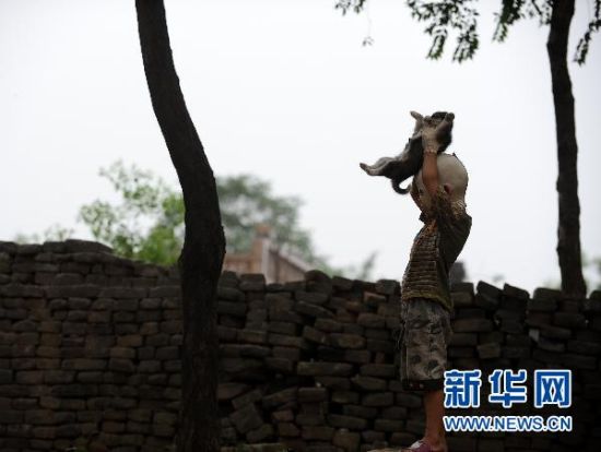 6月22日,湘湘在院子里和小狗一起玩耍。新华社记者 燕雁 摄