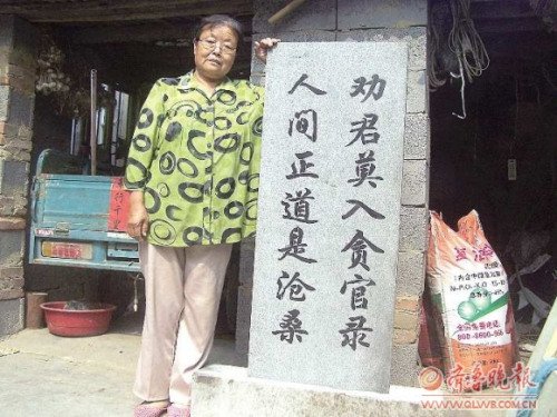 张秀芳老两口说其实他们刻贪官碑的目的就只有一个:立这个碑就是为后人,不要走这条路,走好的路走正路。关系到子子孙孙往正道上发展。张秀芳的老伴陈淑训告诉记者, 立这个碑的目的突出的就是这个字“劝”,劝君莫入贪官录,请不要落在他们这个碑上面。