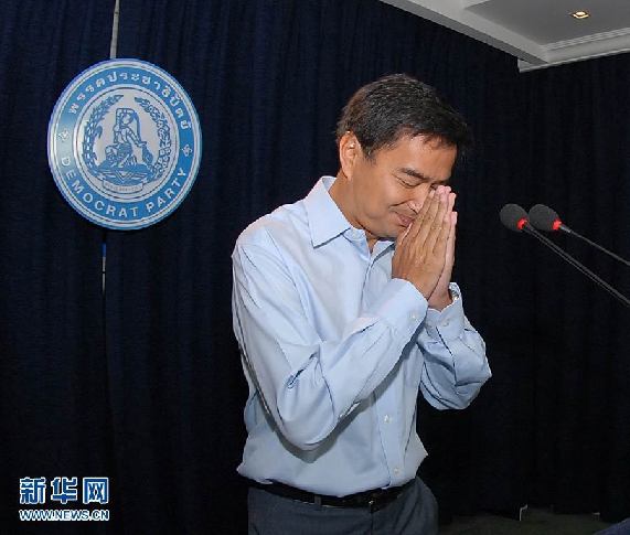 7月4日,在泰国首都曼谷,泰国执政党民主党党首阿披实在新闻发布会上双手合十。泰国执政党民主党党首阿披实4日宣布辞职,以承担选举失利责任。新华社发(拉亨摄)