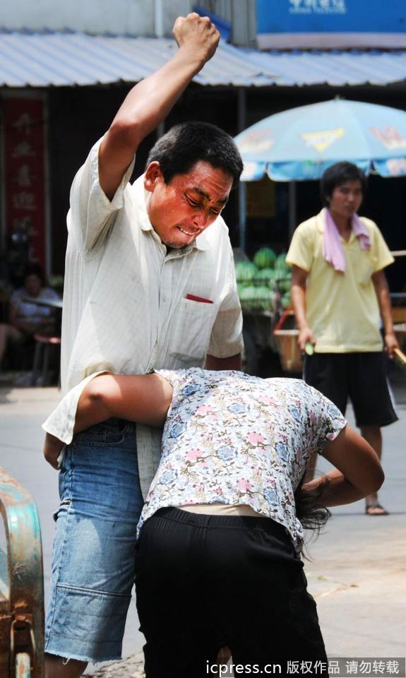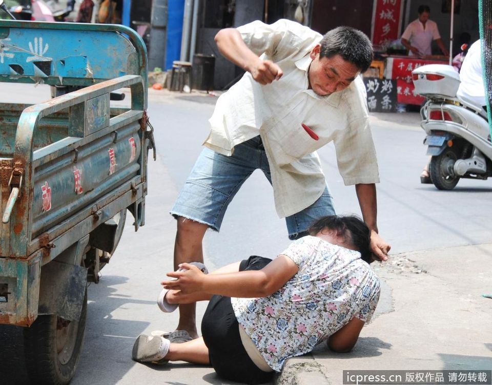 浙江金华打工男子当街暴打妻子(图)