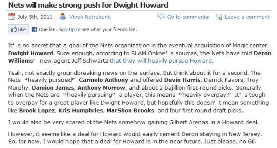 篮网有意得到霍华德已经不是什么秘密,据《SLAM在线》的消息人士透露,篮网已经明确告知德隆-威廉姆斯的经纪人杰夫-施瓦茨,球队将会全力在这个休赛期追逐魔兽。