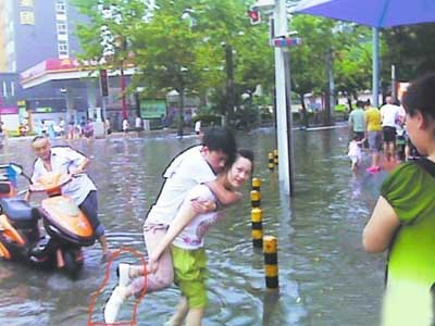 图为暴雨中美女背着男子淌水图片