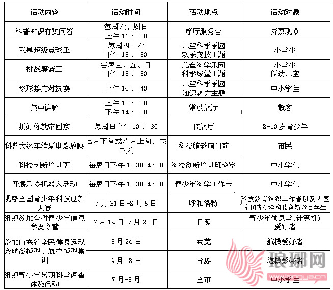 同时,据市科技馆工作人员介绍,凡有意向参加“2011年暑假快乐科普体验”系列科普活动的青少年和市民朋友,均可以按照活动要求,并在活动开始前提前到达场馆报名参加,同时也可以致电市科技馆电话8605668咨询、报名。另外,工作人员还介绍,凡是在科技馆内开展的活动不仅免费,在活动中获得佳绩的青少年朋友还可以获得市科技馆准备的精美礼品一份。