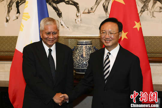 7月8日,中国外交部长杨洁篪在北京钓鱼台国宾馆与菲律宾外长德尔罗萨里奥举行会谈。中新社发盛佳鹏摄