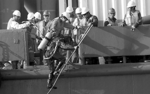“请不要靠近,潜水员正在水下作业!”红色轮船上的一名水手大喊,现在正在进行水下检查。16时15分,一名背着氧气瓶的潜水员从水下浮出。