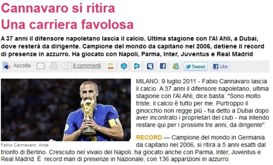 新浪体育讯 北京时间周六,意大利球星卡纳瓦罗宣布由于膝伤原因退役。