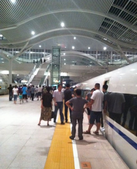 网友“shirley_wang1018”发微博称,停车一小时后,京沪高铁缓缓开车,20分钟后再次停车。另一位网友称,车内无法通风,车身倾斜,乘客情绪激动。工作人员解释是大雨导致接触网断电。