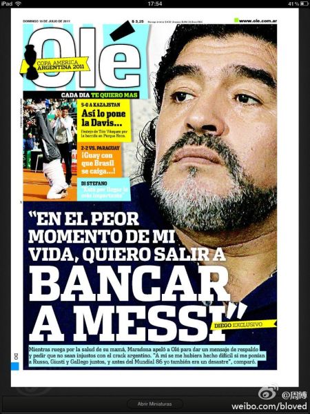 马拉多纳的老妈正处于病危的状况当中,但他表示:“尽管我处于人生最困难的状态当中,我也想要站出来保护梅西。因为他一直在为阿根廷而战,因为他一直热爱阿根廷球衣。当我到医院看我的老妈时,我简直无法忍受那些白痴在电台里喋喋不休地抨击梅西。无论何时,梅西都竭尽所能为球队做着贡献,我这么说是因为我了解他。这周我还跟他谈过,我请求他泰然处之。我们不应该跟把责任都推给梅西,我们拥有世界上最好的球员,一个与众不同的球员……”