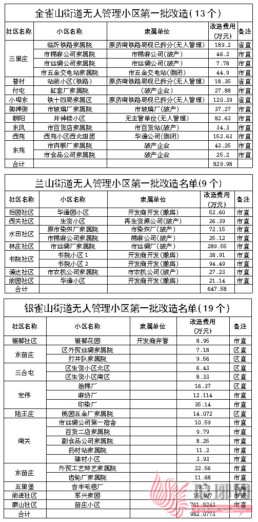 据悉,为了进一步改善城市社区环境,全力做好全国文明城市的测评迎查工作,兰山区组织街道、社区对老旧小区进行了摸底调查,目前全区共有无人管理小区118个,大致分企业破产、开发公司弃管和单位撤销三种情况,经初步估算,改造投资约需5219.1573万元,具体的改造内容为社区环境卫生整治、楼道粉刷、道路补修、消防设施完善、安保设施完善。市创城办提出将118个无人管理小区分成三批,用三年的时间完成改造任务,其中第一批改造小区41个,需投入资金2459.6373万元,计划于今年7月20日前完成。
