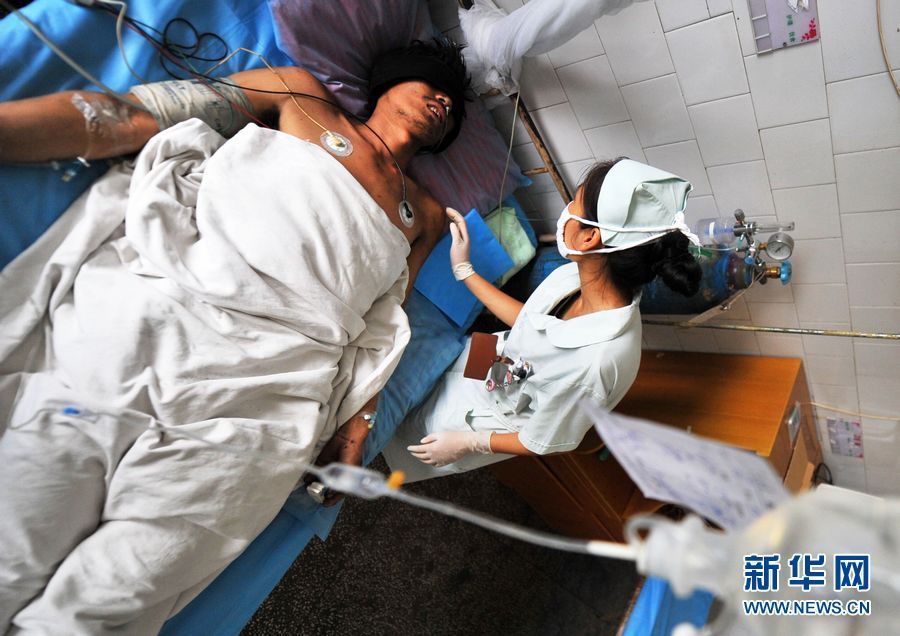 7月10日,护士在对获救矿工刘加干进行护理。