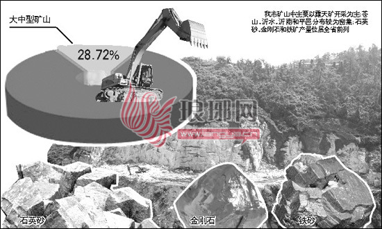 目前,全市矿山数量524个,大中型矿山比例占28.72%。基本上每个县区都分布有矿山,其中苍山、沂水、沂南和平邑四个县区分布较为密集。