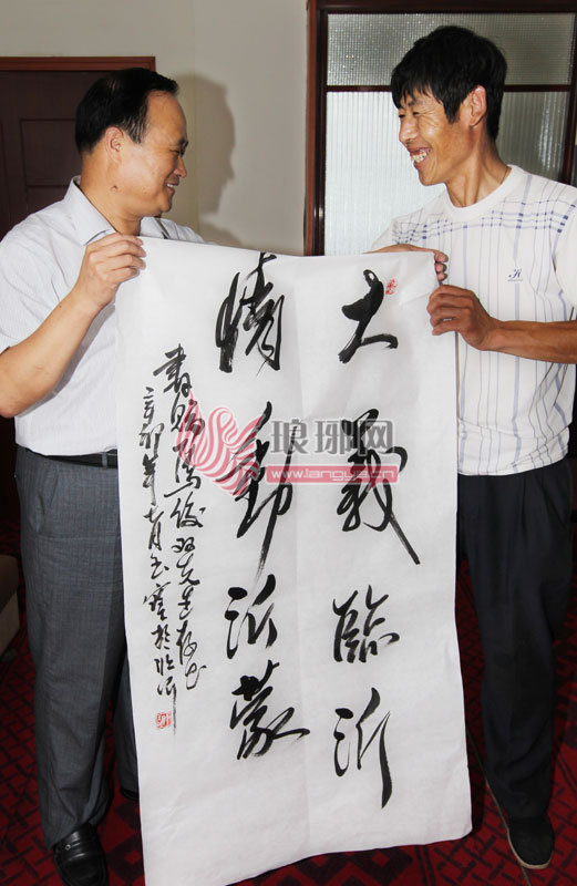 李玉宝早早等在了套房中,见到老马,李玉宝表示,听说老马在临沂生活了7年,临别依依不舍,还为临沂人民免费拉三天客的行为后,他很是感动。“临沂人好客,老马也是个重情重义的外地人。”说着,李玉宝拿起准备好的文房四宝写下“大义临沂 情动沂蒙”八个字送给了老马。