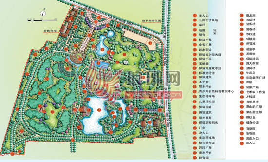 根据公园的基础现状,结合总体规划,改造后的公园包含公园入口区、金雀广场区、滨水活动区、儿童活动区等八个功能区域。借助景观雕塑、小品、音乐灯光系统等充分展示自然界的自然音乐、中外音乐、古今音乐、民族音乐及乐器;通过对自然生态资源、礼乐资源及文化资源的充分挖掘,使音乐文化与自然生态环境实现完美的结合;与此同时,通过丰富园内植物品种,完善植物竖向结构,微调地形,改造水体等,实现公园景观元素的进一步提升。