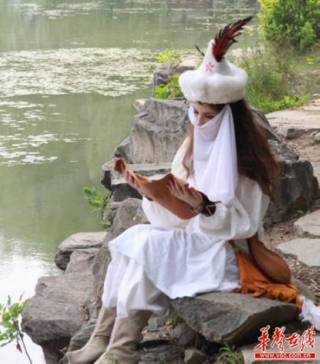“楼兰女”着同样的装束冒着38度的高温天气现身北大校园,并在未名湖畔静坐看书,还做出跪拜祈祷的动作。