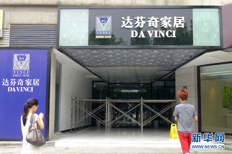 7月14日在杭州拍摄的达芬奇家居门面。7月13日,因未取得消防安全许可证,达芬奇家居杭州店被杭州市上城区公安分局消防大队责令停业。7月14日起,该店关门停业并贴上了消防部门的封条。新华社发