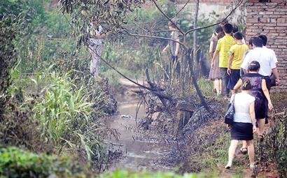 民警走后,邱军用闵巧云的公用电话拨打114,查到了当地环保局的电话。他让村里的大学生陈兵(化名)向当地环保局细说,又请一位村民用矿泉水瓶到水沟里取样保存。