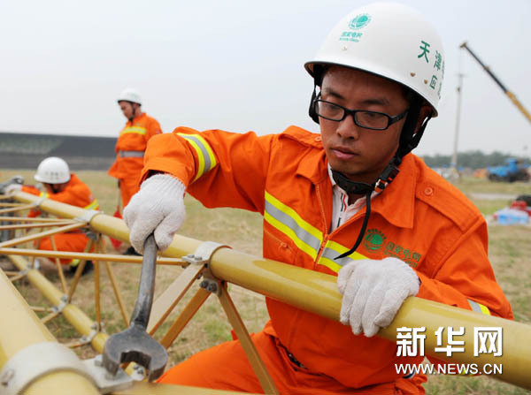6月21日,演习人员在进行受损输电线路快速抢修的演练。当日,国家电网天津市电力公司举行地震灾害应急技能实战演练。新华社记者刘海峰摄