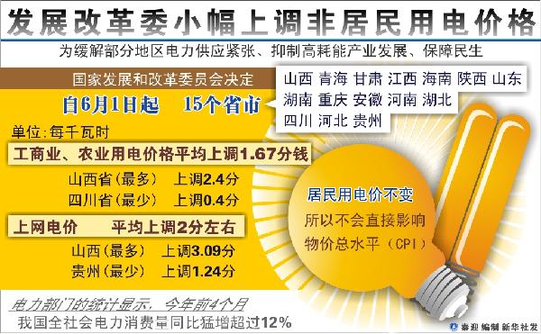 6月1日起,15个省市工商业、农业用电价格平均每千瓦时上调1.67分钱,但居民用电价格不变。这是自2009年以来销售电价的首度上调。本次电价调整涉及的15个省市包括山西、青海、甘肃、江西、海南、陕西、山东、湖南、重庆、安徽、河南、湖北、四川、河北、贵州。对于电价上调的政策背景,业内人士表示,眼下蔓延全国多省的电力紧缺是这轮上调电价的最直接原因。