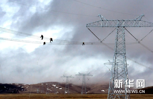 施工人员在海拔5000米以上的可可西里架设输电电缆(6月12日摄)。据悉,被称为“电力天路”的我国西部大开发重点项目——青藏联网工程将力争年内建成投运,这意味着西藏电网与全国电网将实现联网,从而根本上解决西藏缺电问题。新华社记者熊红明摄