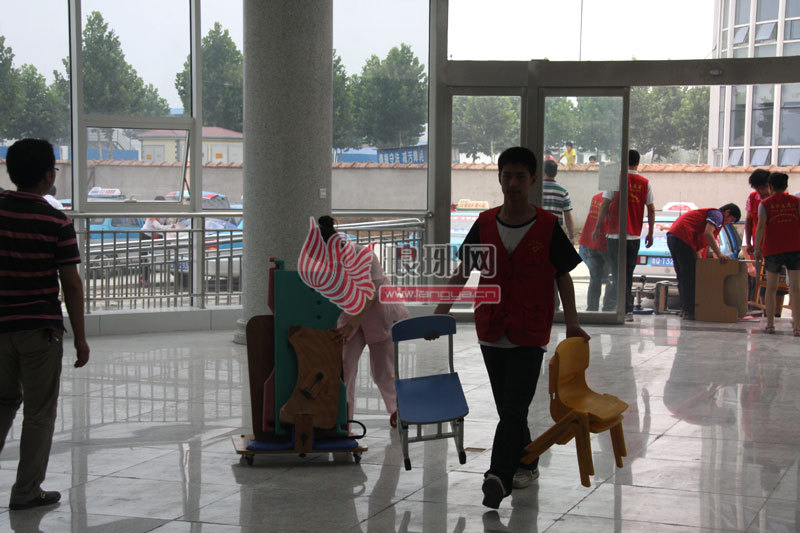 16日上午,临沂市儿童福利院喜迁新居。图为志愿者将孩子们的生活用品搬入新家。