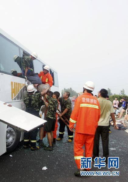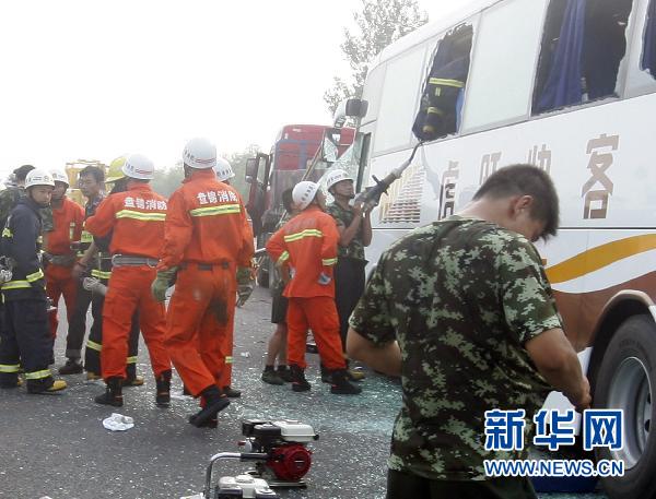 7月17日,救援人员在京沈高速盘锦段交通事故现场抢救乘客。新华社发