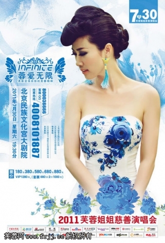 近日,芙蓉姐姐瘦身成功后的多组写真在网络上遭到曝光,很多网友把芙蓉姐姐瘦身到98斤当做人生标杆,而她更是打着演唱会将亲授减肥秘籍的口号为演唱会大肆宣传,截止到昨天下午,芙蓉姐姐2011“蓉爱无限”北京演唱会门票已售近半。而此次的演唱会门票竟高达1280元。王菲2010巡唱北京站的票价为300元到2500元,这样看来,“蓉爱无限”的票价比天后王菲的演唱会票价也低不到哪里去。