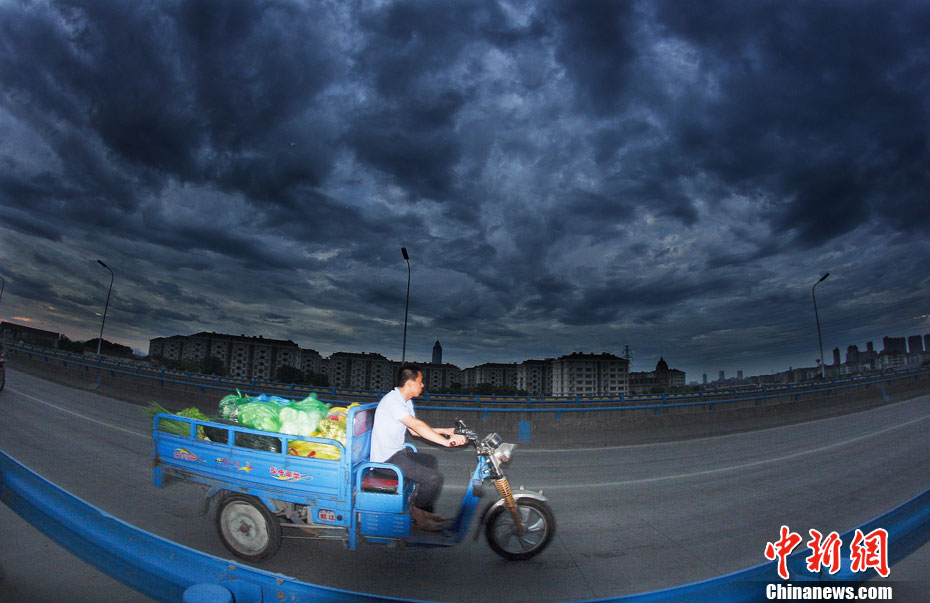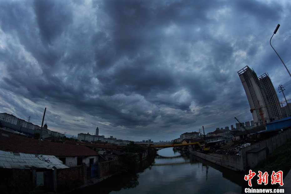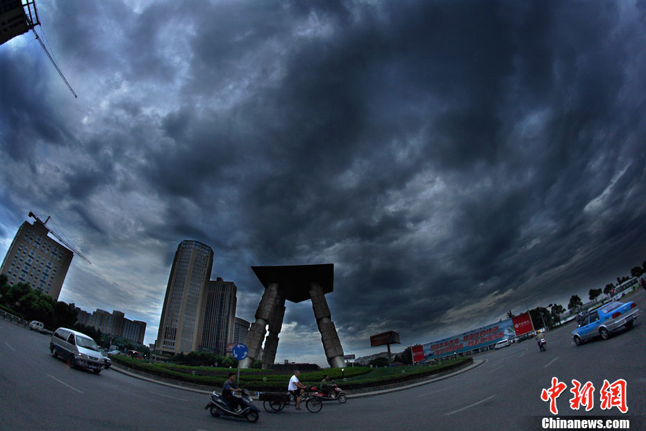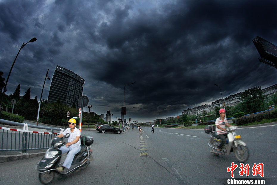 7月18日早晨,第六号超强台风“马鞍”外围云系侵袭浙江绍兴。乌黑厚实的云层覆盖在绍兴市区的上空,白昼如夜。