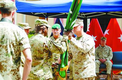 7月18日,在阿富汗首都喀布尔北约驻阿部队总部,新任美国驻阿富汗部队最高指挥官约翰·艾伦(右)接过旗帜。(新华社发)奥米德摄