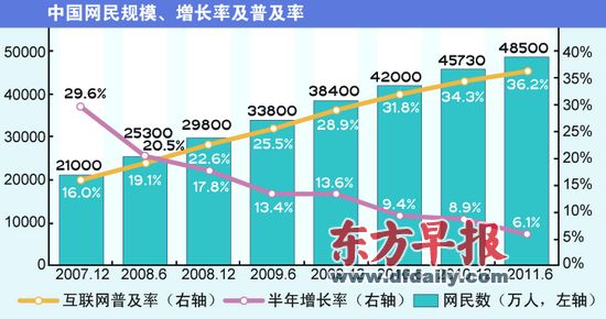 中国互联网络信息中心(CNNIC)昨日发布《第28次中国互联网络发展状况统计报告》。报告显示,截至今年6月底,中国网民规模达到4.85亿,较2010年底增加2770万人,增幅6.1%。其中,手机网民规模达到3.18亿,较2010年底增加了1494万人。手机网民在总体网民中的比例达65.5%,成为中国网民的重要组成部分。