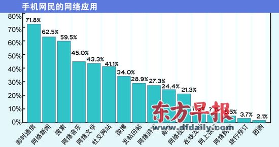 2011年上半年,网民手机上网应用中,手机即时通信仍然是使用率最高的应用,使用率达到71.8%,较2010年底的67.7%略有提升。即时通信工具用户群体大、手机即时通信软件预装率高等都为手机即时通信应用的普及提供了保障。