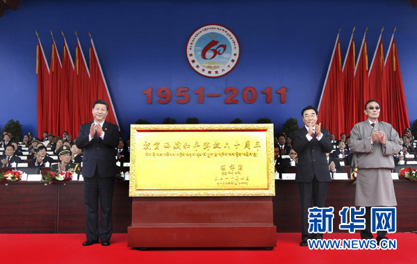 7月19日,西藏各族各界干部群众2万多人欢聚在布达拉宫广场,热烈庆祝西藏和平解放60周年。中共中央政治局常委、国家副主席、中央军委副主席、中央代表团团长习近平出席庆祝大会并发表重要讲话。这是习近平向西藏自治区赠送中共中央总书记、国家主席、中央军委主席胡锦涛题写的“祝贺西藏和平解放六十周年”贺匾。新华社记者兰红光摄
