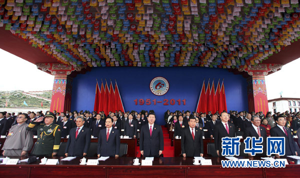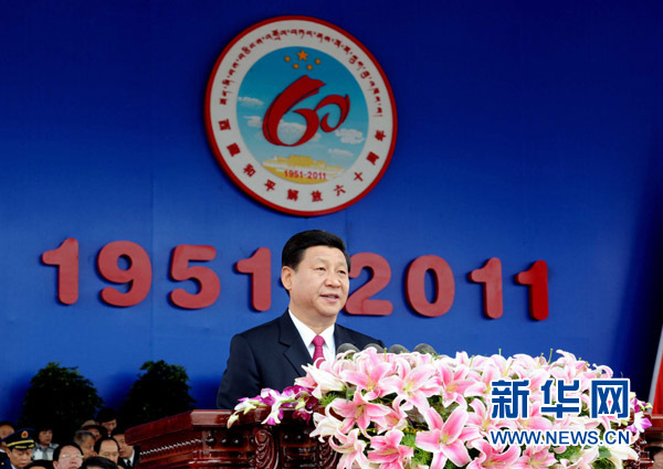 7月19日,西藏各族各界干部群众2万多人欢聚在布达拉宫广场,热烈庆祝西藏和平解放60周年。中共中央政治局常委、国家副主席、中央军委副主席、中央代表团团长习近平出席庆祝大会并发表重要讲话。新华社记者兰红光摄