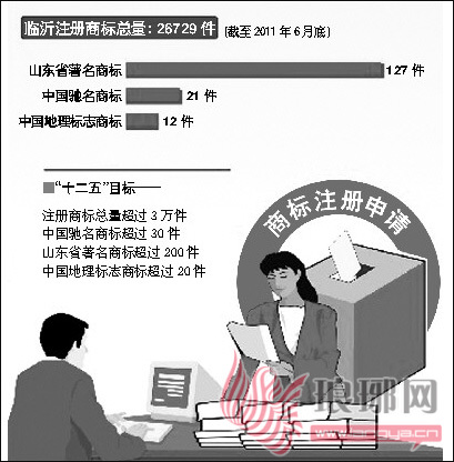 “十二五”期间,临沂市将实现注册商标总量超过3万件,拥有中国驰名商标超过30件,山东省著名商标超过200件,中国地理标志商标超过20件。