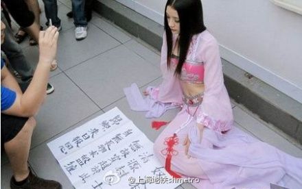 简介:一浓妆艳抹的古装女子惊现上海地铁站台,引发大量行人围观。更雷的是,女子还掏出iphone,向围观市民要手机号。女子膝下铺有一卷,上书:奴家本是清源村人士,无故穿越於此,身无长物,求盘缠回乡,来日报恩。