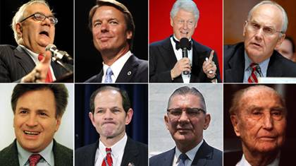 (曾身陷性丑闻的美国政要,上排从左到右为:前马萨诸塞州州代表巴尼·弗兰克,参议员约翰·爱德华,前总统比尔·克林顿,国会参议员拉里·克雷格;下排从左到右为:前阿肯色州州长迪克·莫里斯,前纽约州州长艾略特·史皮策,国会议员威尔伯·米尔斯,国会议员斯特姆·特蒙德)