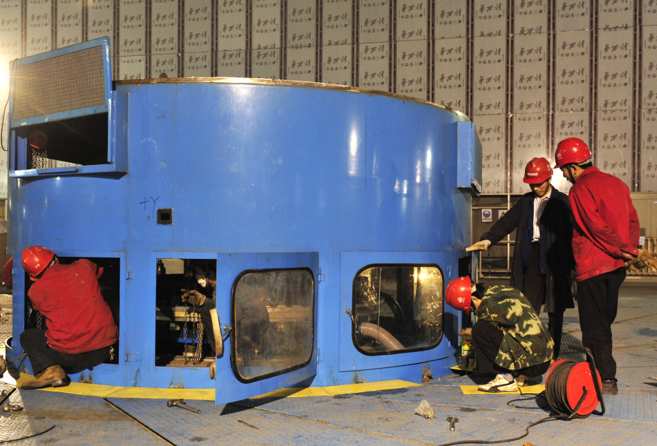 4月26日,工程技术人员加紧对三峡地下电站30号机组进行安装施工。 当日,三峡地下电站32号机组率先启动了充水实验,进入投产发电前的有水调试阶段。按计划,若调试顺利,地下电站首台机组将于5月正式投产。三峡地下电站6台机组中有3台机组计划于今年汛前陆续投产,其中拟最先发电的32号机组安装调试进展顺利、进度最快,另2台发电机组目前也正按计划组装并联机调试。