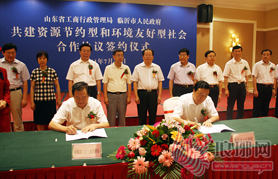 22日上午,省工商局与临沂市人民政府正式签署共建资源节约型和环境友好型社会战略合作协议。山东省工商局党组书记、局长李华理等省工商局领导,市领导张务锋、孟宪海、朱绍阳、申长友、李峰、马崑,市政府秘书长钱迎伟参加签约仪式。