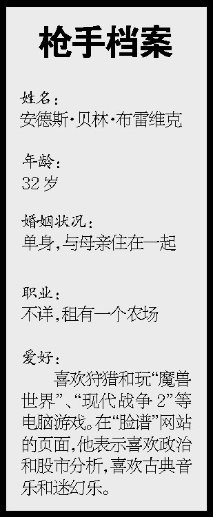 在一家知名社交网站的个人主页上,布雷维克在用户资料中描述自己是“保守派”,信基督教,单身,喜欢狩猎和玩“魔兽世界”、“现代战争2”等电脑游戏。
