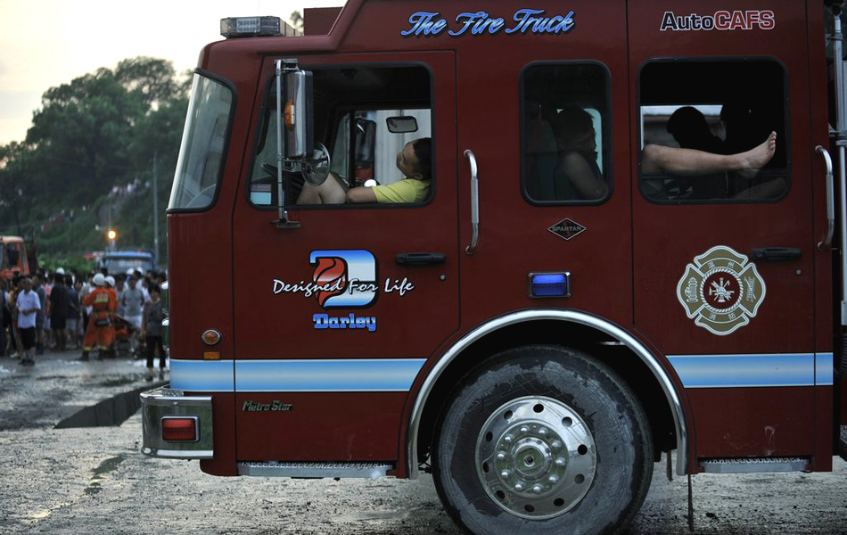 为了防止切割作业时产生火花引发火灾,数辆消防车在事故现场待命。