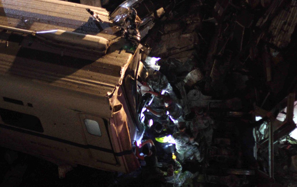 7月23日晚上20点34分,北京到福州的D301与杭州到福州的D3115发生追尾。两车方向一致,行至在双屿路段下岙路时,D3115遭到雷击后失去动力停车,造成D301追尾,D301列车第1至4位车厢脱轨,D3115列车第15和16位车厢脱轨,目前已致上百人伤亡。图为事故现场。