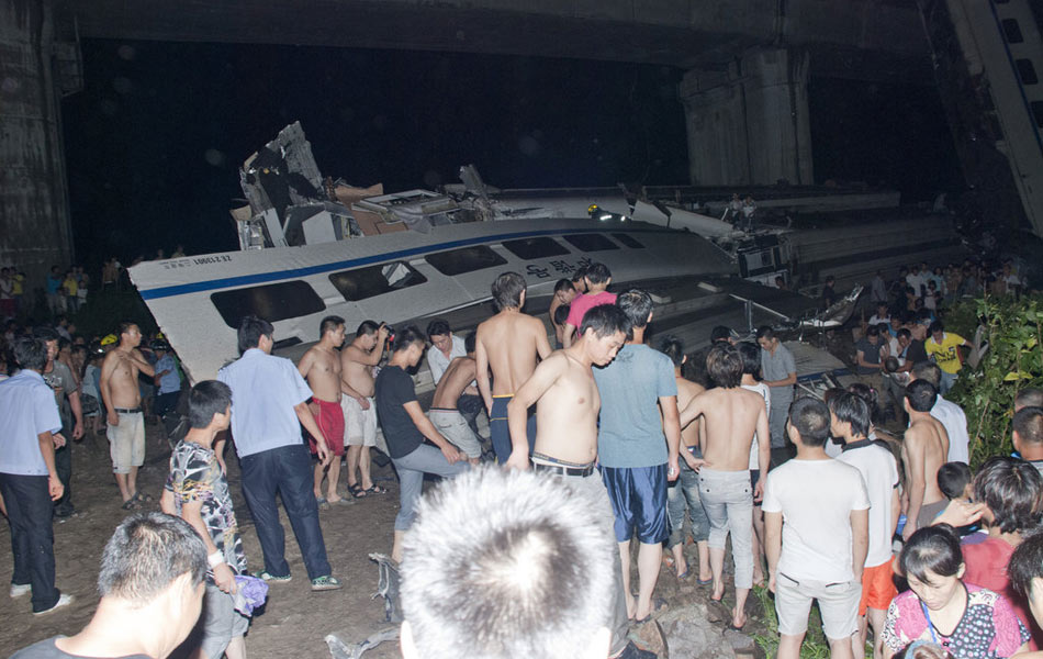 据央视报道,从高架桥上坠落的车厢为满员。事故发生后,温州消防支队立即调集官兵前往参与救援。截至23日23时许,温州消防支队已经出动280多名官兵参与救援。图为坠落的动车车厢前,众多民众围观。