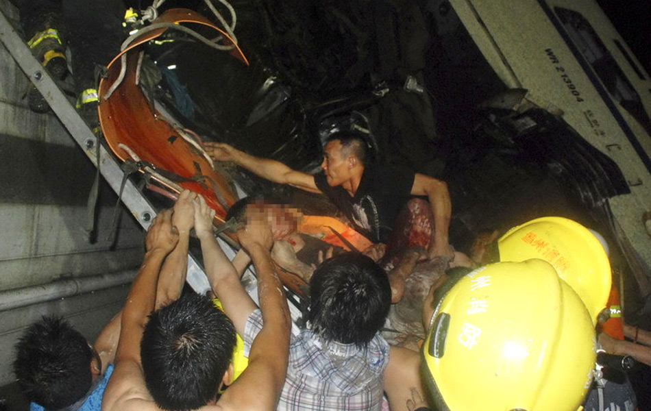 据了解,事故发生后,受伤旅客很快开展自救。事故发生后,有旅客大声喊镇静,不要动,有旅客拿安全锤敲窗,但是根本敲不开。图为消防人员将一名重伤旅客救出。