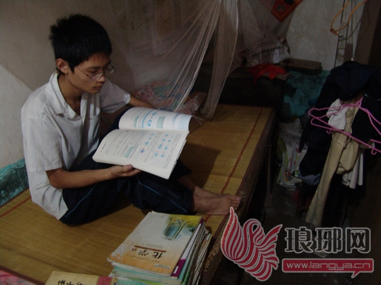 李来恩的卧室不足四平米,刚好放下一张两尺见方的课桌和一张80公分宽的小床,桌子和床上堆着一摞摞的课本和书籍,家里没有电风扇,也缺乏光亮,狭小的空间使人有些压抑。“在家白天忙完农活,晚上我都是坐在这床上看书,只有挤时间多学一些,才能更接近成功。”李来恩习惯于在别人恬静安眠的时候熬夜苦读,多一分耕耘,才能多一倍收获。他说自己学习成绩之所以优秀,是因为孜孜不倦的努力,“成功=99%努力+1%天赋”。
