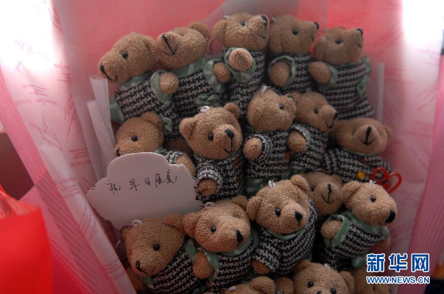爱心人士送来的玩偶摆在重症监护室外(7月27日摄)。