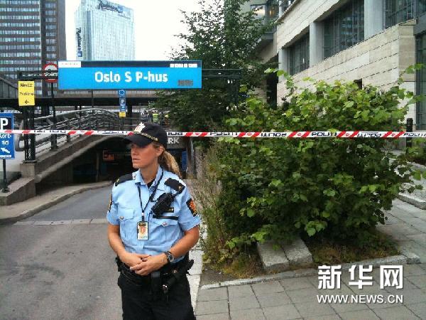 7月27日,安保人员在挪威首都奥斯陆的一火车站外警戒。当日,奥斯陆一火车站因发现可疑包裹被迫关闭。挪威首都奥斯陆和于特岛在22日发生爆炸及枪击事件,造成76人死亡。 新华社/法新