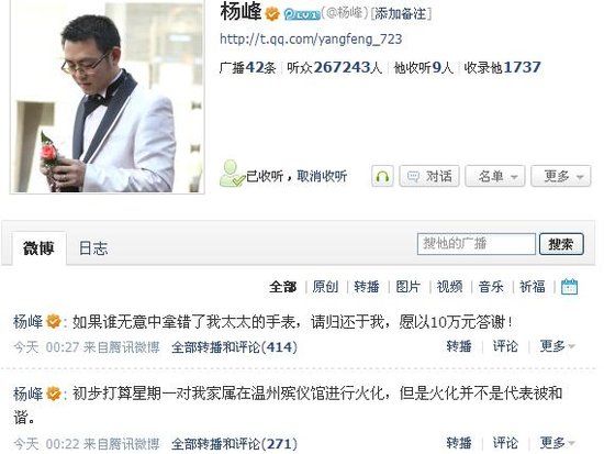 这是温州动车事故遇难者陈碧的丈夫杨峰,29日凌晨发布的求助微博。杨峰称,这块欧米茄手表,是他送与妻子的订婚礼物。