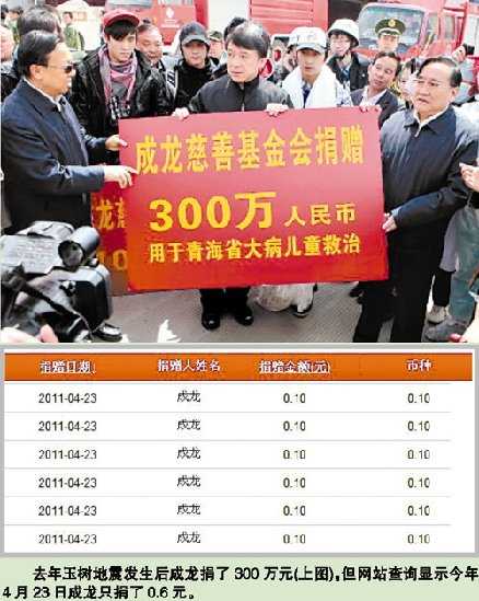 记者试着输入刘德华的名字,平台显示,他在玉树地震前两个星期就“先知先觉”地捐款20万元人民币;输入“成龙”,则显示2011年4月23日,他先后6次捐赠0.1元给红十字会;输入“陈光标 ”、“曹德旺”的名字,系统显示没有搜索结果……记者查询新华网报道发现,2010年4月18日,成龙、徐若瑄等一行从西宁机场乘坐救援飞机前往玉树地震灾区进行爱心捐赠活动。此次成龙慈善基金会为玉树灾区捐赠300万元人民币、1500箱饼干、700件棉衣、100箱矿泉水。